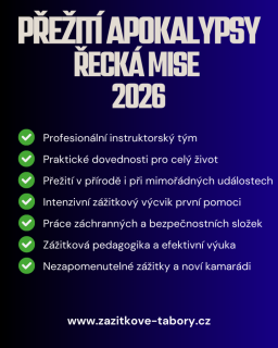 | 25.07. - 08.08.2026 (15 dnů) | 6 - 17 | 90 | 50 | 9 998 Kč (Do 25. ledna 2026 lze uplatnit 5% slevu za včasné) |