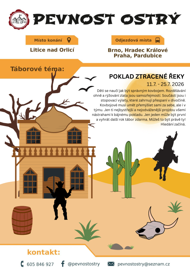 Celotáborová hra na téma Poklad ztracené řeky. Děti se naučí jak se stát správným kovbojem Naučí se samostatnosti, ale i týmové spolupráci. Vítěz získá nejen titul Kovboj roku, ale i tábor na příští rok zdarma.