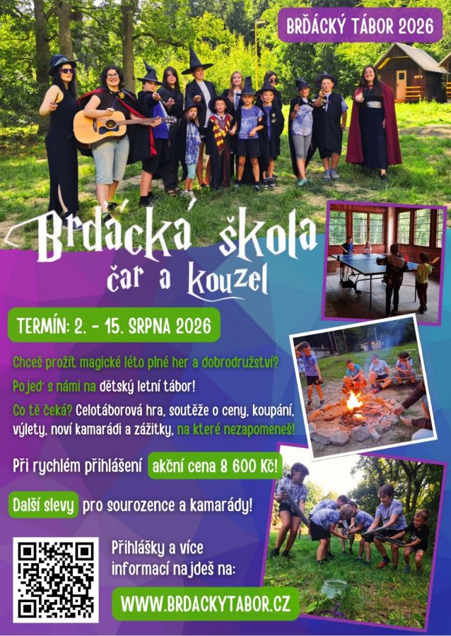 Skvělý tábor - dva týdny v Brdech - Střední Čechy Hledáte letní dětský tábor, kde vaše děti prožijí dny plné her, objevování a nových kamarádů? S námi se léto změní v doslova magickou výpravu plnou smíchu, dobrodružství a nezapomenutelných zážitků! Brďácký tábor 2026 je tu pro vás 2. – 15. srpna 2026 Pro děti od 6 do 15 let Dva týdny za 8.600 Kč – tj. 615 Kč/den SPECIÁLNÍ SLEVA PRO RYCHLÍKY při přihlášení do konce ledna! Další slevy pro sourozence a kamarády O vaše děti se postará zkušený tým včetně skvělé lékařky Vedoucí mají bohaté tábornické zkušenosti a především mají rádi děti Mají pochopení pro jejich zájmy i pro jejich starosti Komunikují s nimi velmi přátelsky - jsou jejich většími kamarády Nemají problém s udržením kázně a pořádku a dokážou to bez zbytečného stresu Zvládají začlenit do kolektivu i děti introvertní, samotářské Na táboře panuje příjemná, přátelská atmosféra Pojeďte s námi na letní dětský tábor a prožijte kouzelných 14 dní uprostřed brdské přírody Přihlášky a podrobné informace na webu: https://www.brdackytabor.cz/
