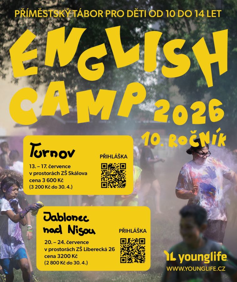 Je tu již desátý ročník Young Life English Campu v Turnově a třetí ročník v Jablonci nad Nisou! Můžeš se těšit na hodiny zábavné angličtiny s rodilými mluvčími z USA. Zažiješ velkou kempovou hru, různé workshopy, sporty, outdoor a spoustu dalších dobrodružství. Všechno tohle pro tebe připravila skvělá a zkušená parta vedoucích z Young Life Turnov, The Bouda a tým z USA. Na kempu nebude chybět ani odpolední Klub plný hudby, scének, her, zábavy, překvapení, i zamyšlení nad životem z pohledu křesťanských hodnot (odpuštění, pomoc bližnímu, týmovost, odvaha jít proti proudu, budování přátelství atd.). Přijď si zlepšit angličtinu, užít si týden nabitý skvělými zážitky a poznat kupu nových kamarádů. Moc se na tebe těšíme!