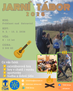 Oddíl TOM Sirius z Ostravy nabízí jarní tábor v době jarních prázdnin Ostravy pro děti ve věku 8 - 15 let. Děti čeká celotáborová hra, hry v chatě i venku, sportovky, hudba a dobré jídlo! Cena tábora je 2500 Kč.