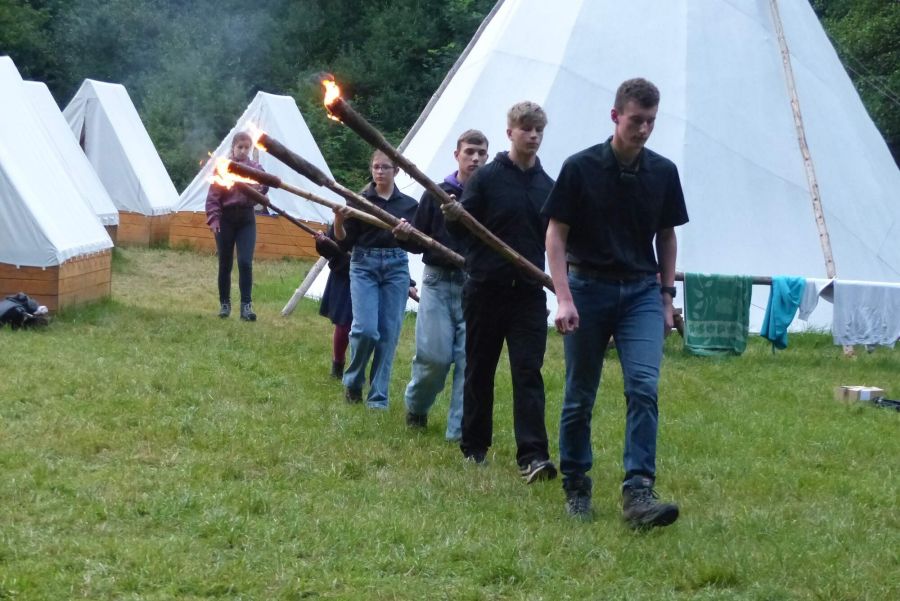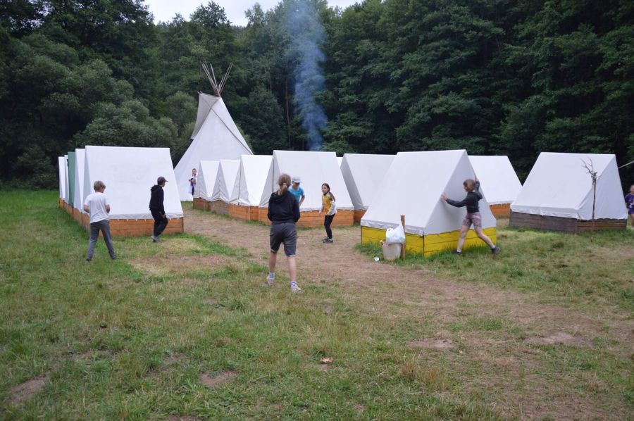 Tábor je postaven na zelené louce, kterou v původním stavu na konci také opouštíme. Základem pro bydlení jsou stany s podsadou a teepee. Mimo to je vybudována základní budova z velkého vojenského stanu sloužící jako společenská místnost a jídelna. Vaření je umožněno díky polní kuchyni.