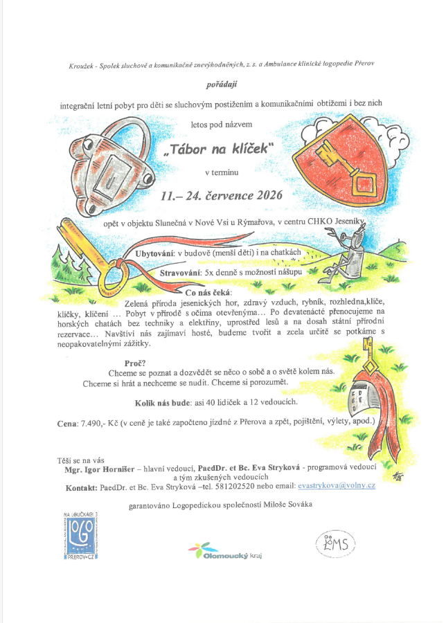 "Tábor na klíček" Čtrnáctidenní tábor je zaměřen na děti se sluchovým postižením, komunikačními problémy a v menší míře i pro děti zdravé.