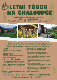 Rezervace: 605 846 474 , E-mail: MCeplova@seznam.cz , více informací a fotogalerii z minulého léta najdete na našem Facebooku: LETNÍ TÁBOR NA CHALOUPCE