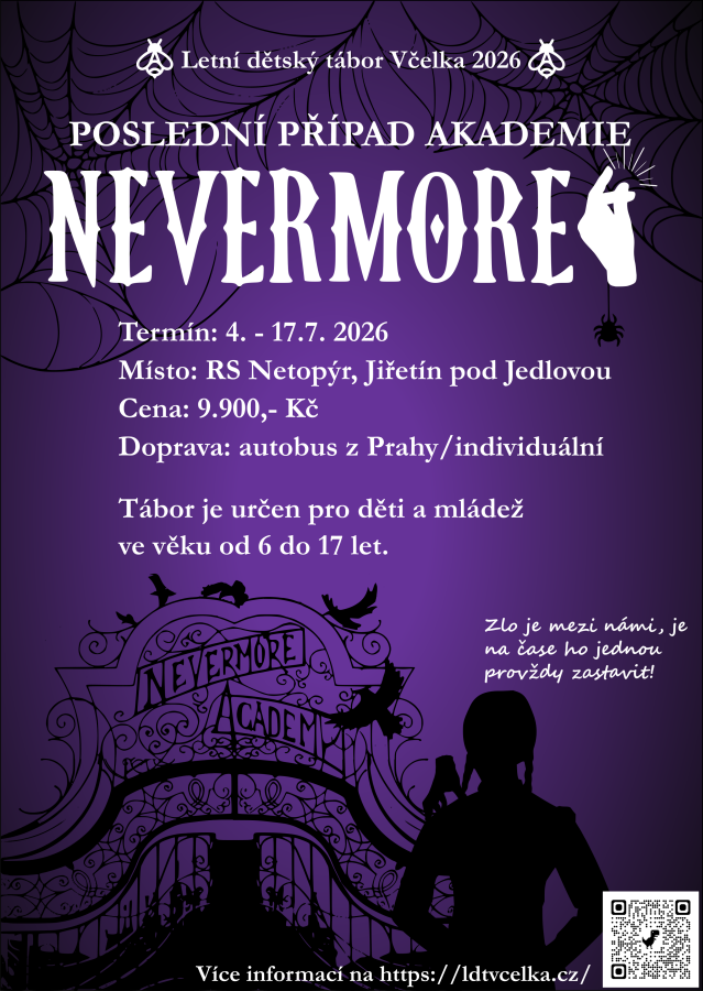 Poklidnou atmosféru Akademie Nevermore naruší nepříjemná událost, za kterou stojí neznámý zloduch. Osvědčí se zdejší studenti jako detektivové a podaří se jim pod taktovkou ostřílené Wednesday neznámého zloducha dopadnout? Vydejte se se Včelkou v létě 2026 na tábor a o výsledku se přesvědčte na vlastní kůži!