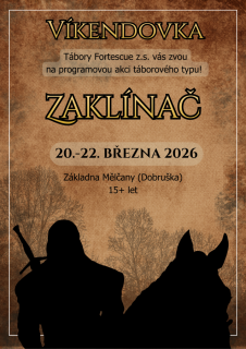 Víkendovka programově začíná v pátek v 19:00 a končí v neděli v 11:00. Je to akce hlavně pro ty z vás, kterým chybí táborové hry a táboroví lidi. Hlavním cílem je užít si vypětí svých sil i v běžném roce a zachytat si nějaká ta monstra, která narozdíl od zápočtu z matiky jednou klepnete po hlavě a pak už máte pokoj. Pojeďte se s námi řezat meči.